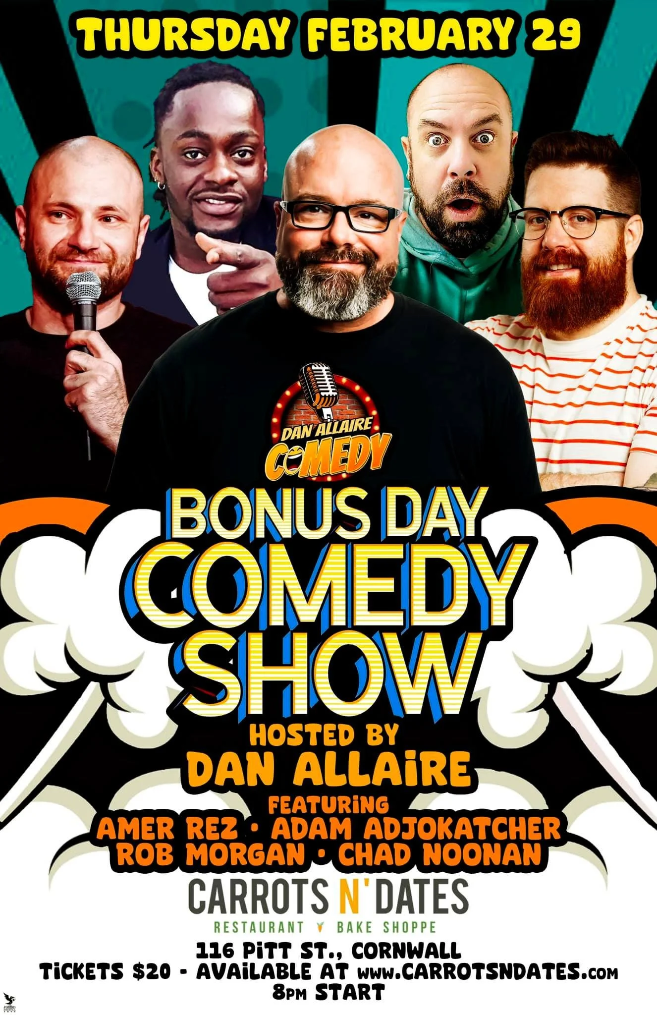 Back to All Events CORNWALL Bonus Day Comedy Show (Headliner) Thursday, February 29, 2024 8:00 PM 9:30 PM Carrots N' Dates 16 Pitt Street Cornwall, ON, K6H 6M2 Canada (map) Google Calendar ICS headlining this cool show in Cornwall! Let’s go!