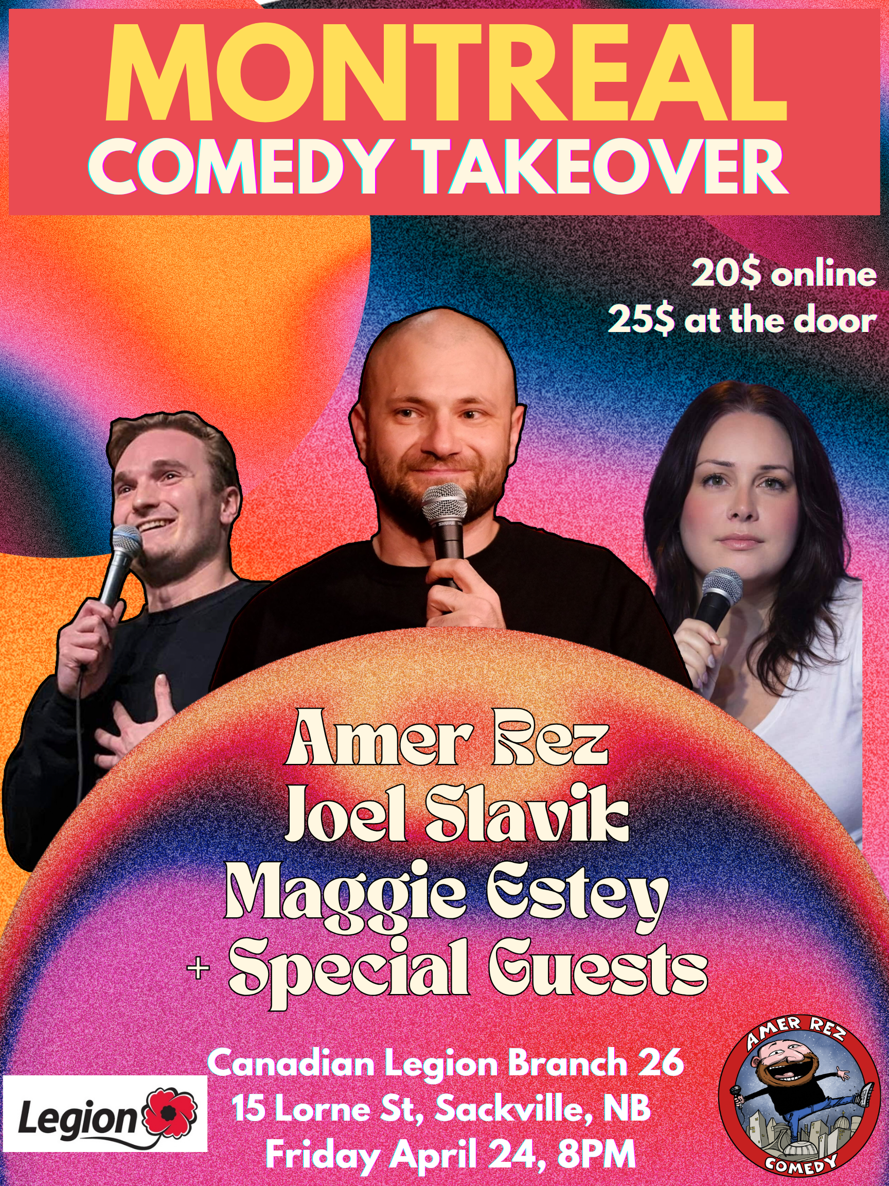 Looking for things to do in Sackville NB? Get ready for a night of live stand-up comedy as the Montreal Comedy Takeover brings top comedians from Montreal to the Canadian Legion Branch 26.